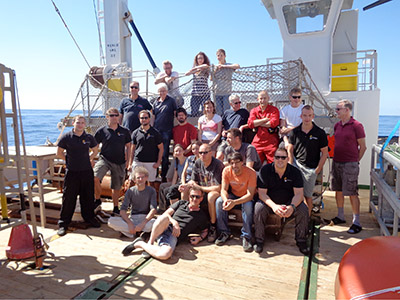 Left: The MIDAS-TREASURE team and the crew of RV Pelagia during the first leg of 64PE398 cruise. Photo by M. Lavaleye.