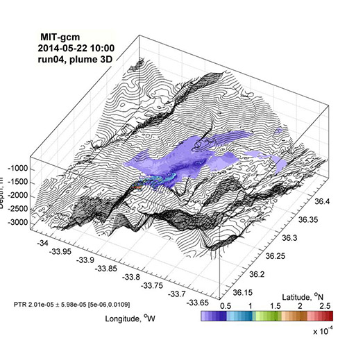 Enhanced mixing of neutral buoyant plume in dynamic environments of tidally induced internal waves (IW) bouncing between steep side walls of a deep narrow rift valley. This image shows a 3D snapshot of rising plume dispersal from a Rainbow hydrothermal vent field at the Mid Atlantic Ridge (36°14’N), bathymetry is shown every 50 m. On ARCHER the MITgcm numerical simulation of the largest documented natural plume in the deep Atlantic provides a proxy to assess environmental impacts of expected human activity. Image: Dimitry Aleynik, Scottish Association for Marine Science.
